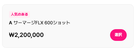 | ⚡サーマージFLX 600ショット | ₩2,200,000 | 約242,000円 | 痛み軽減&強力引き上げで大人気 |
