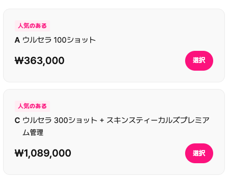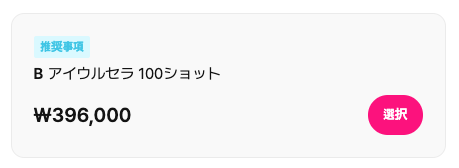 | 👁アイウルセラ 100ショット | ₩396,000 | 約43,560円 | 目元専用ウルセラ/繊細な施術対応 |