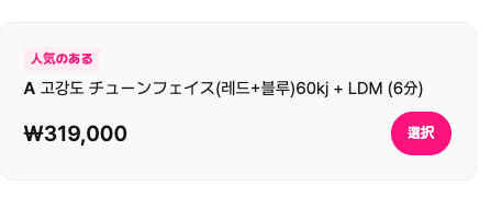 | 🌈チューンフェイス(レッド+ブルー)60kj + LDM(6分) | ₩319,000 | 約35,090円 | ダウンタイム少なく、肌の奥から再生ケア |